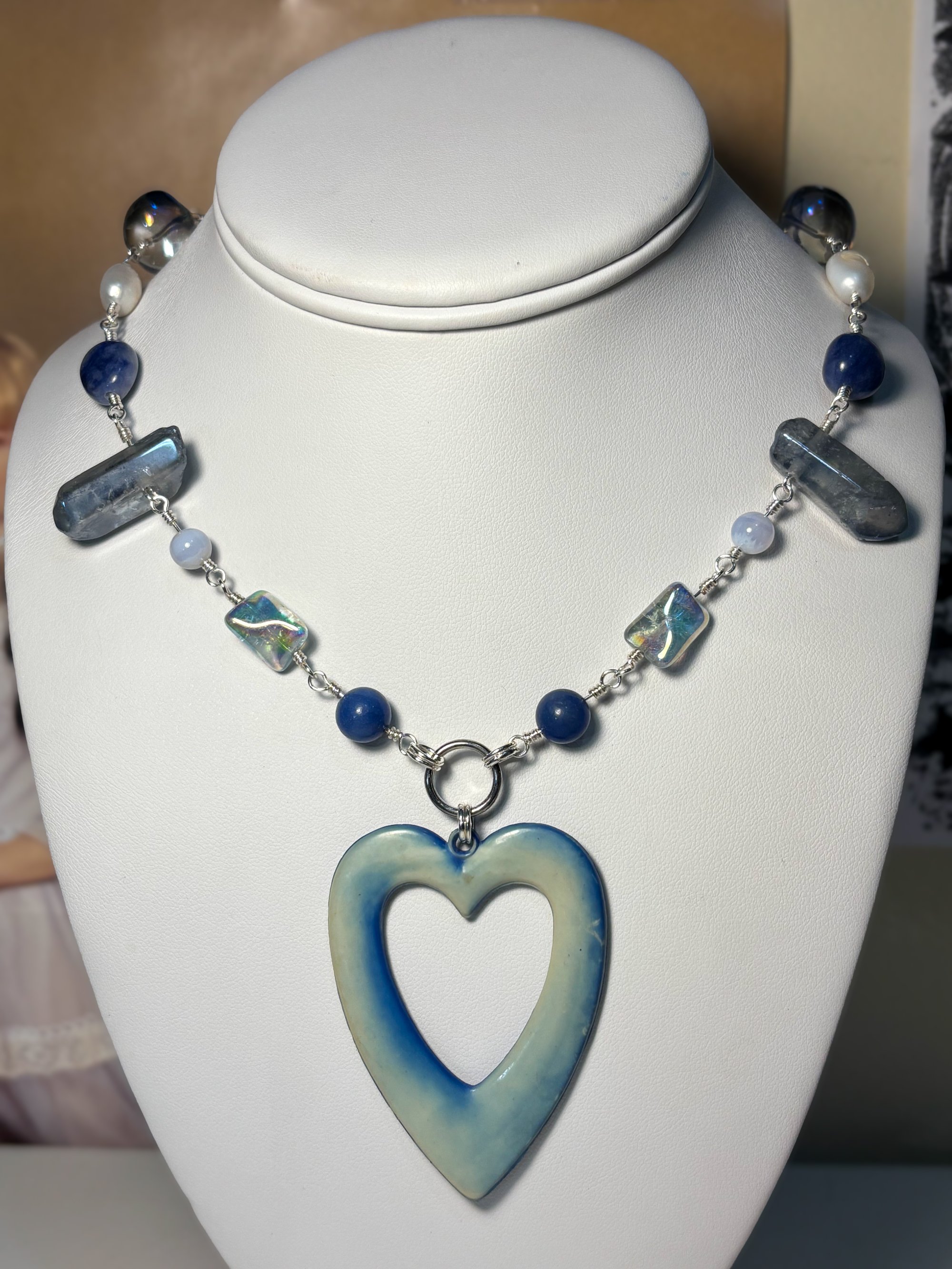 materials: angel aura quartz, sodalite, lapis lazuli, freshwater pearl, dyed quartz, blue lace agate, glass beads