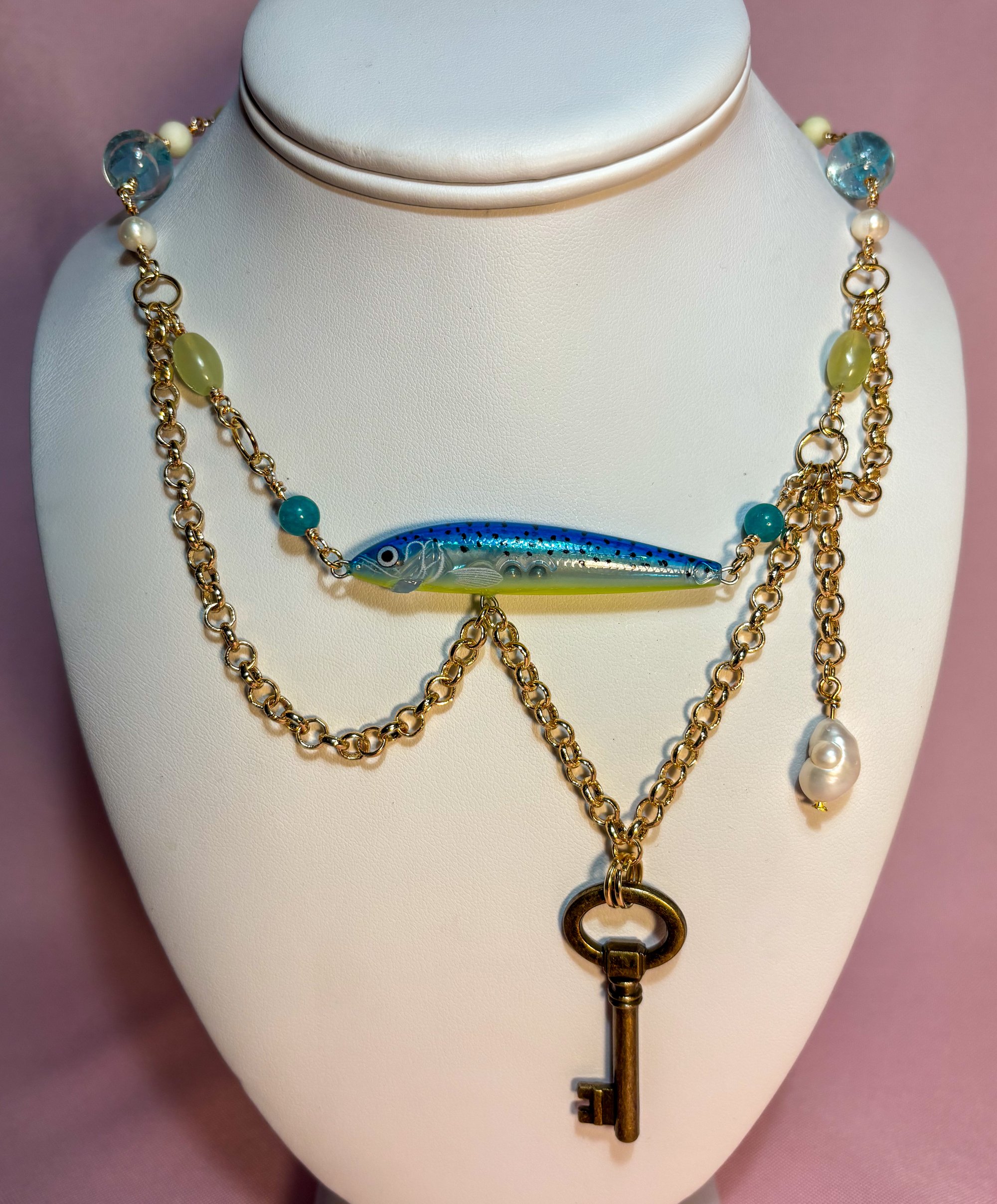 materials: quartz, freshwater pearl, glass beads, frosted jasper, with gold-plated wire/chain/findings