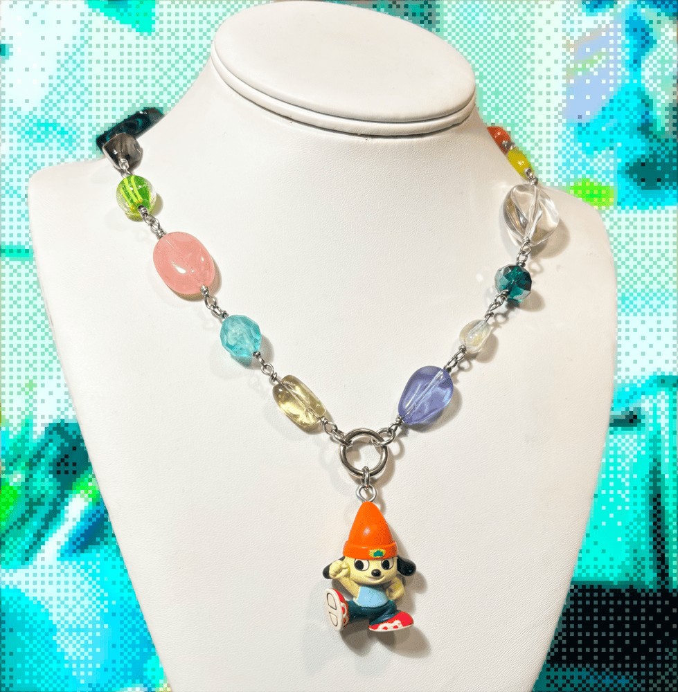 materials: official vintage ‘parappa the rapper’ mini figure imported from japan and upcycled ★ stainless steel hardware, assorted glass beads, assorted semi-precious beads